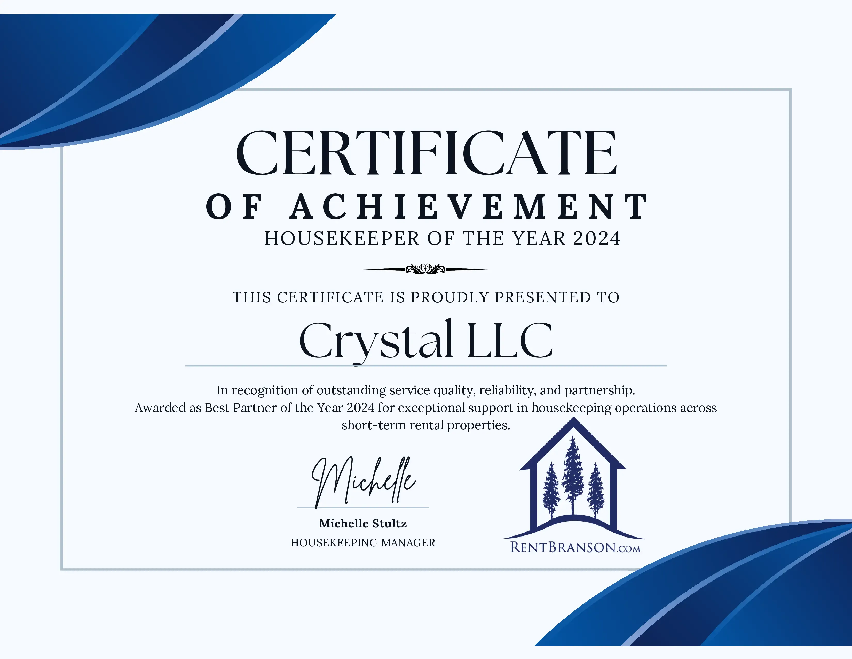 Crystal LLC has been recognized by RentBranson as a top cleaning partner.